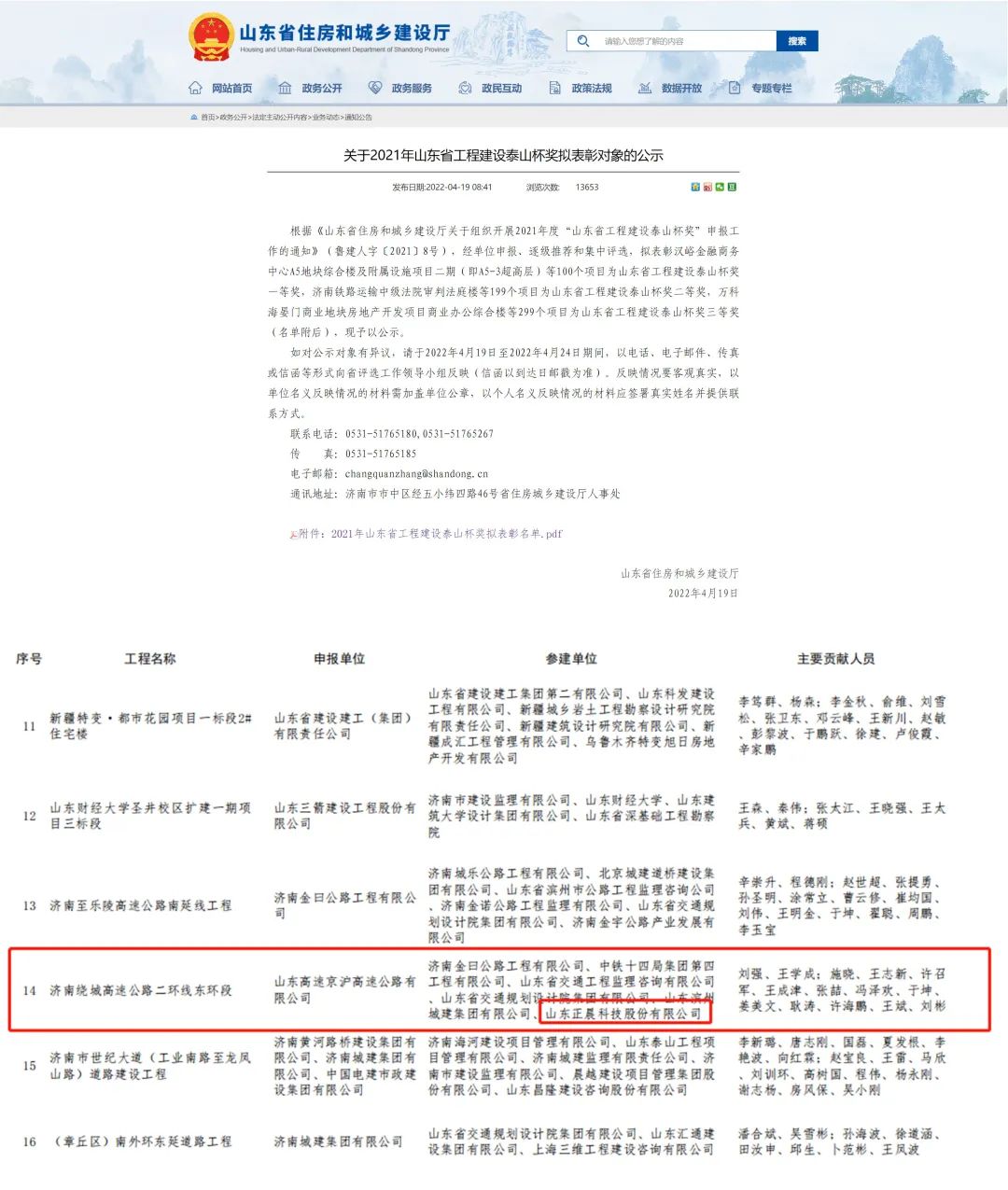 山东省工程建设泰山杯奖(以下简称泰山杯奖)是我省建筑工程最高荣誉奖。公司负责济南绕城高速公路二环线东环段房建工程的建设任务。项目于2020年3月1日开工建设,2020年11月26日建成通车。